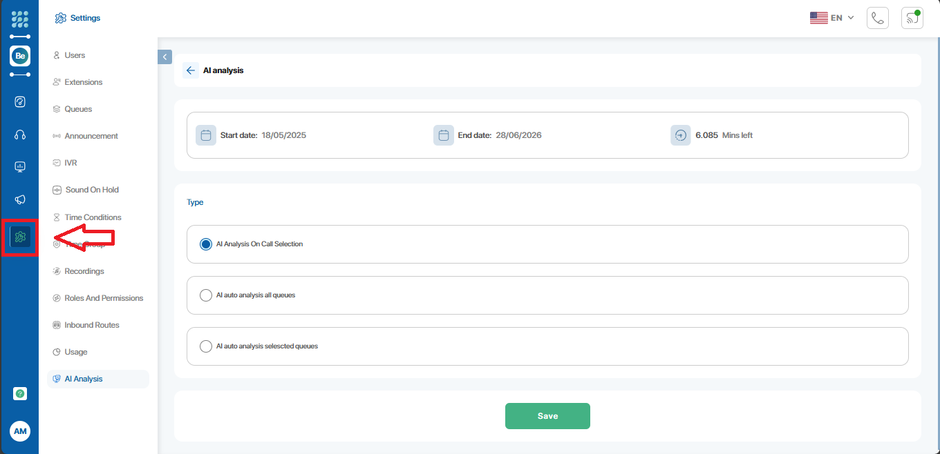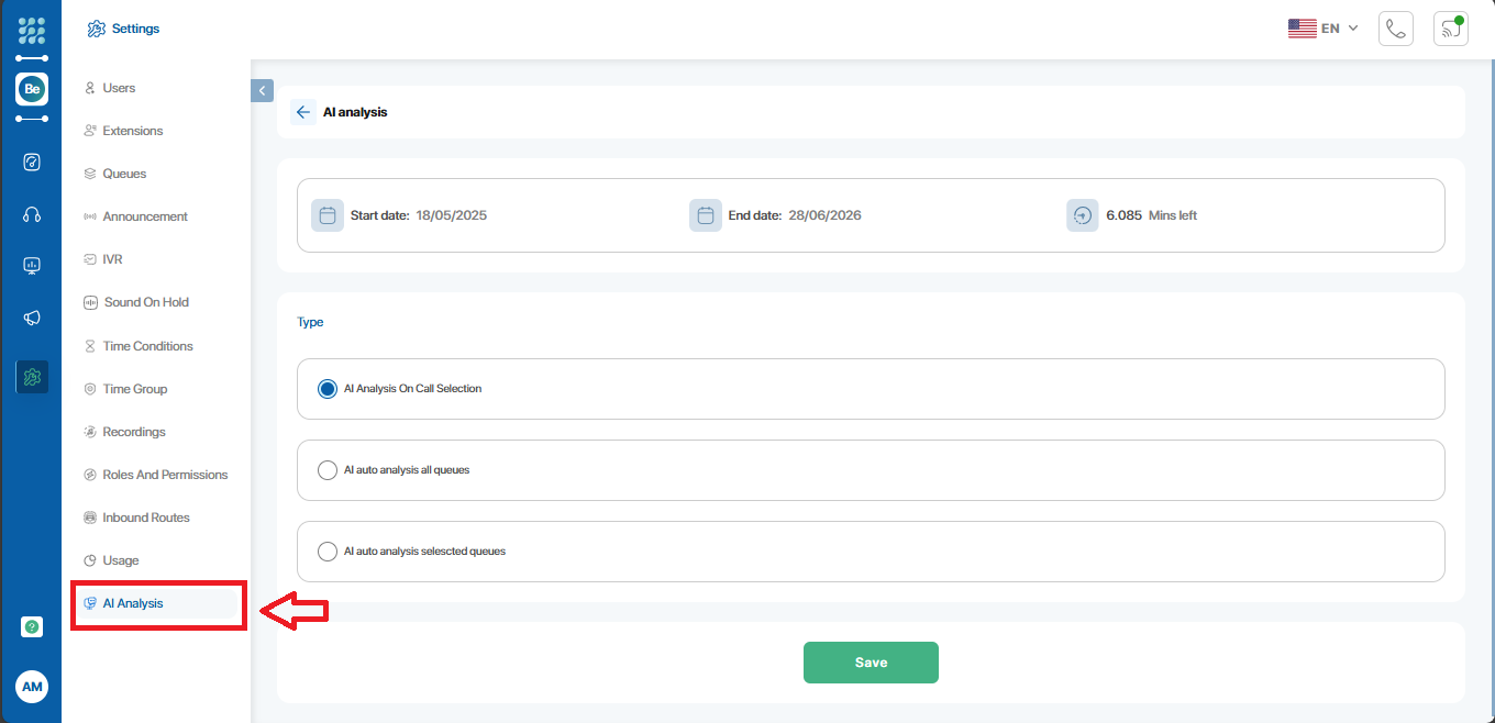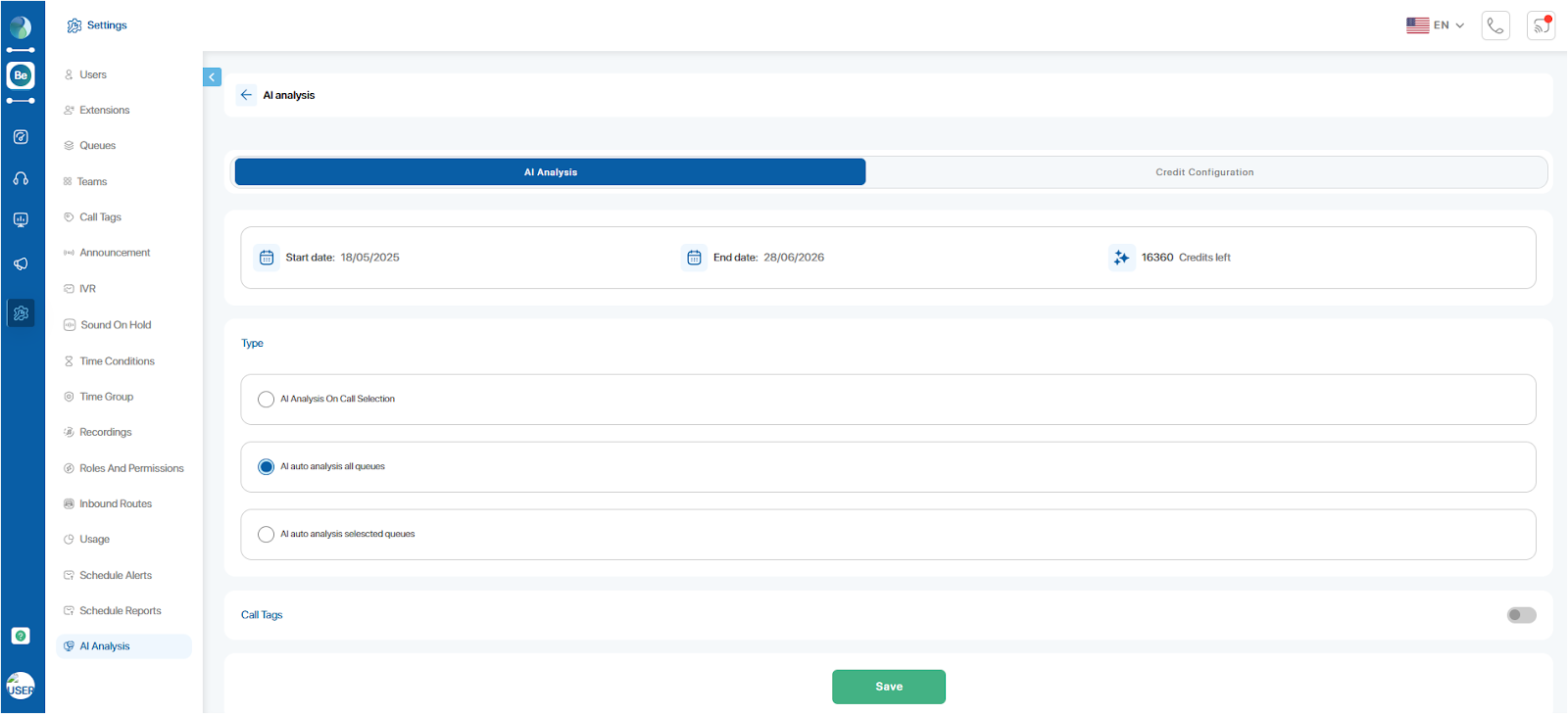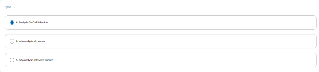 This interface allows you to configure how AI-powered call analysis is performed within your system. The AI analysis can be done for specific calls you select manually, for all queues automatically, or for selected queues automatically. It’s a powerful feature for gaining insights into your call data and improving performance.