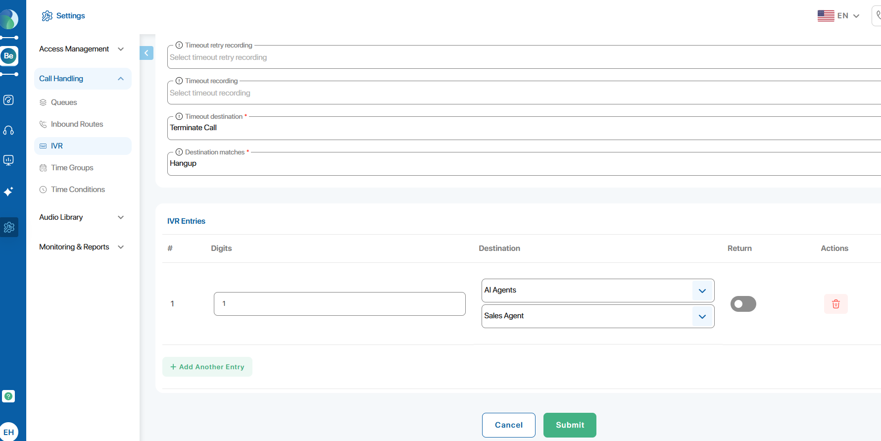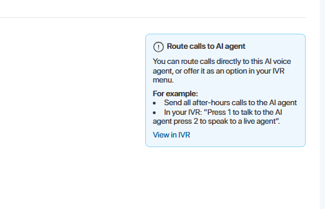 Once your AI agent is connected via IVR, your callers can reach it automatically or by selecting it through a menu, streamlining support and saving live agent time.