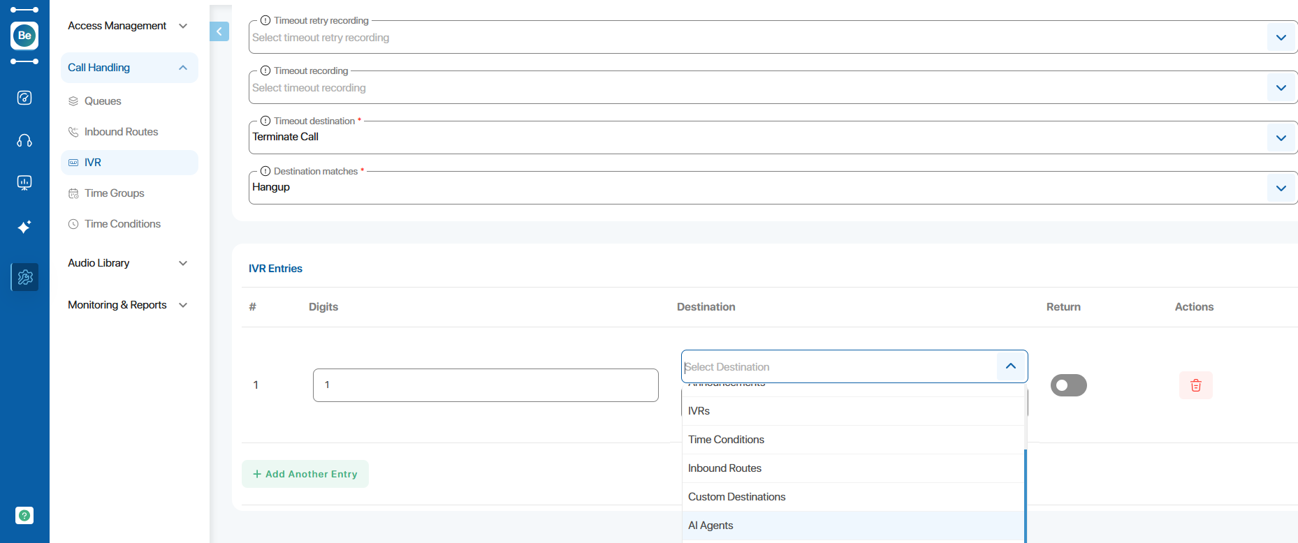 The IVR (Interactive Voice Response) system lets you define how incoming calls are handled, routed, and responded to, including routing calls directly to your AI VoiceAgent.