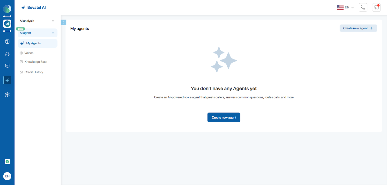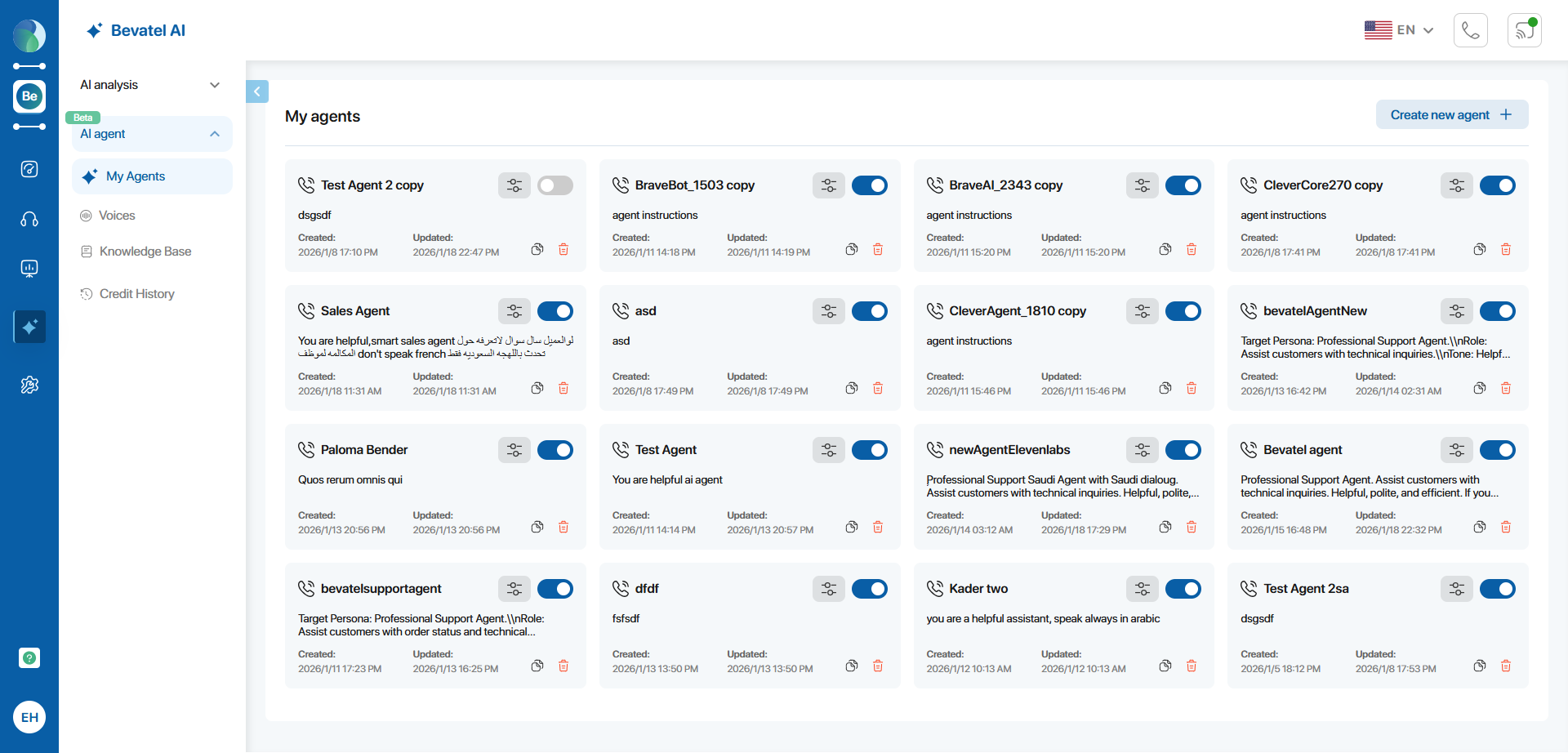 The My Agents screen is the central dashboard for viewing, accessing, and managing all AI VoiceAgents created within your Bevatel workspace.