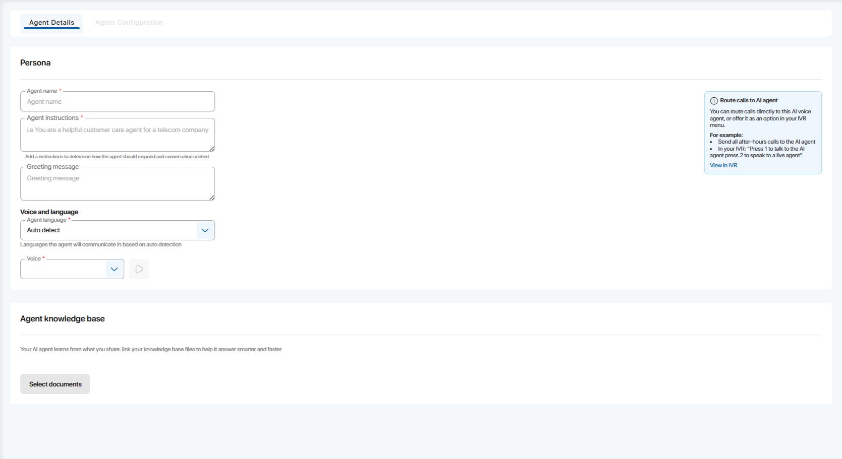 define the identity and core behavior of a new AI Voice Agent. It includes agent instructions, greeting messages, voice selection, and knowledge base linking.
