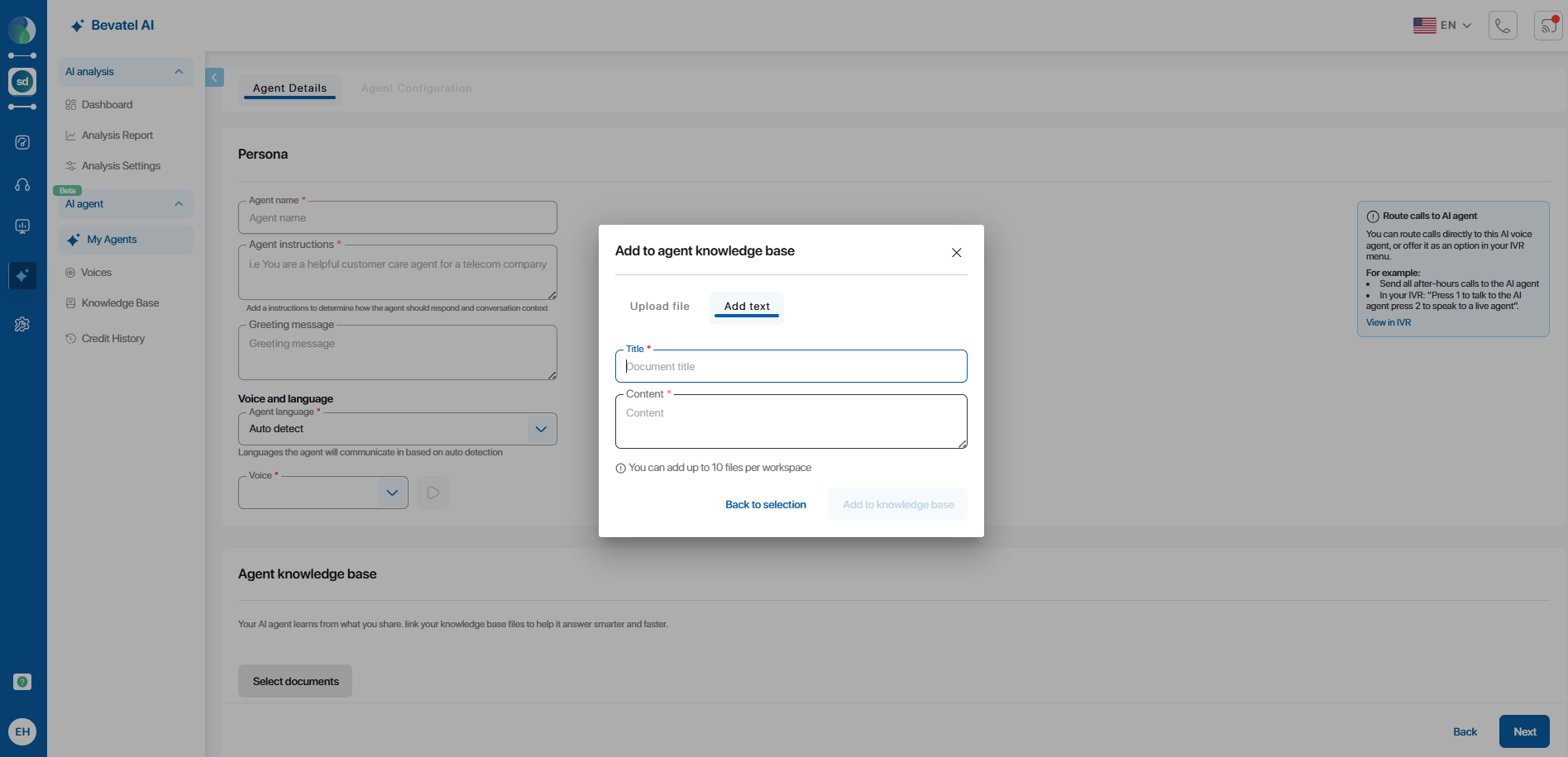 1- Click the “Select documents” button under the Agent knowledge base section.