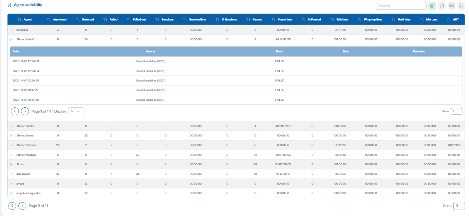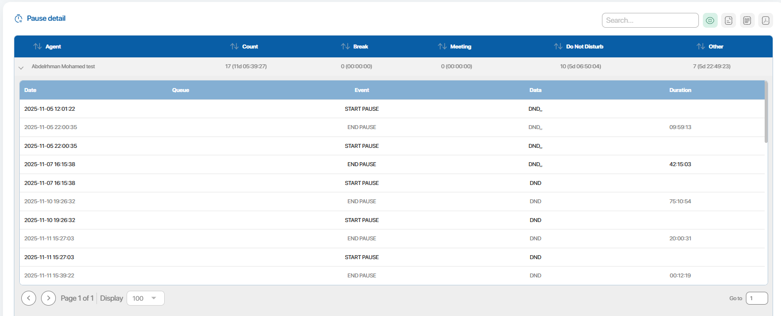 Each agent row can be expanded to show a subtable listing detailed pause entries.